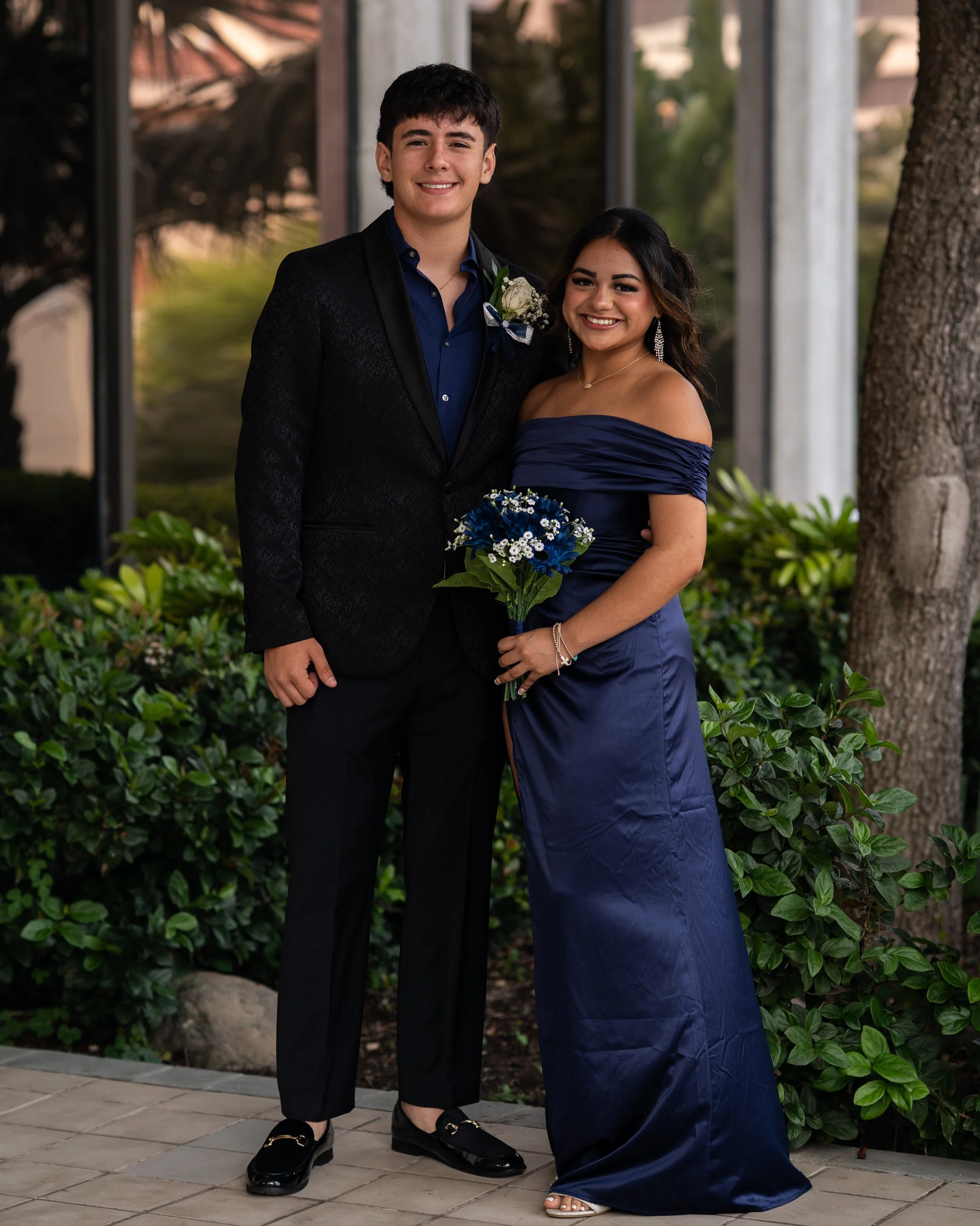 A young man and woman dressed in formal attire, standing outdoors near bushes and a tree, smiling at the camera. The woman holds a bouquet of blue and white flowers. The man is wearing a black suit with a blue shirt, and the woman is wearing a blue o