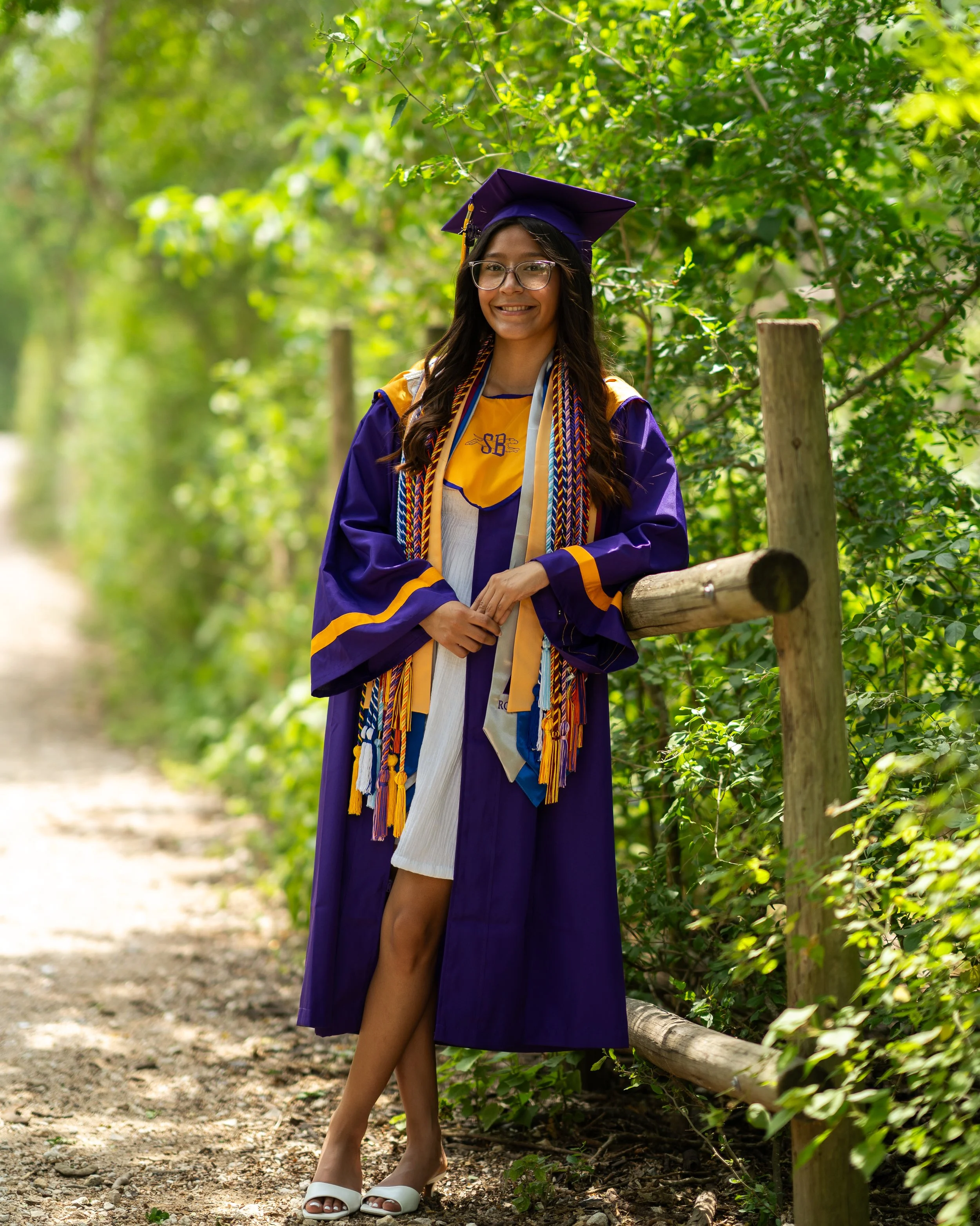 Graduation woman in purple gown and cap, decorated with cords and medals, standing outdoors on a dirt path near greenery, smiling.
