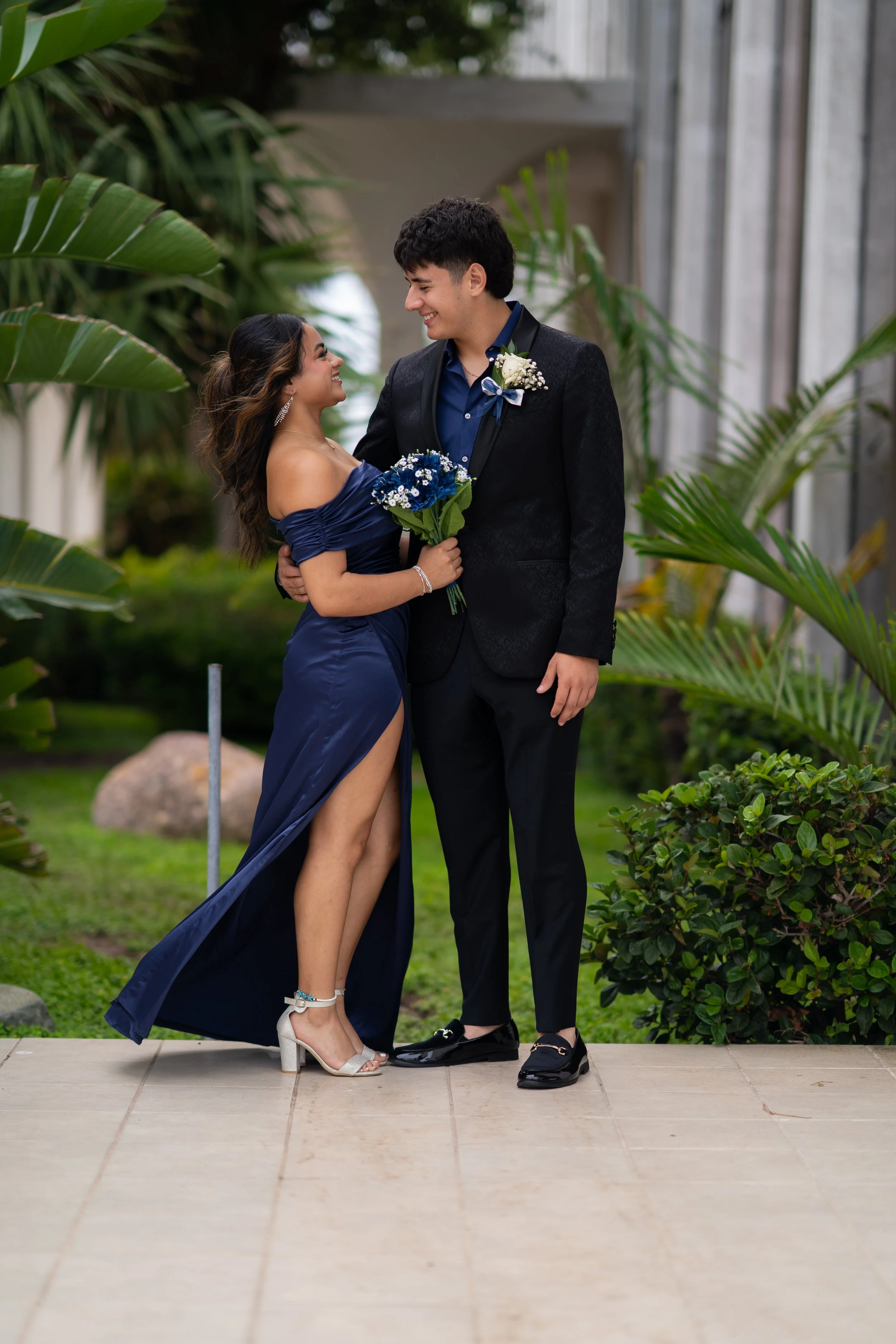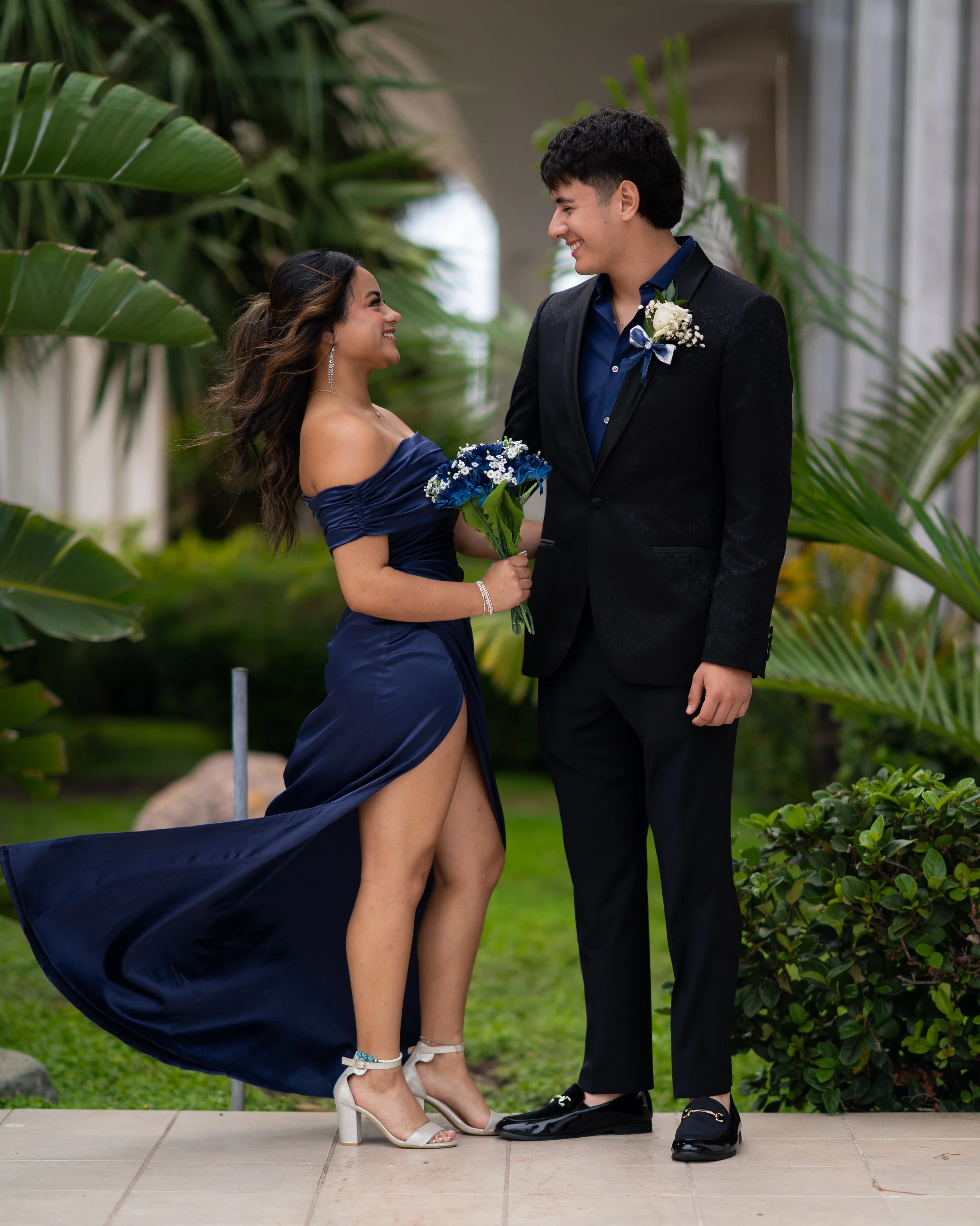 A young woman in a blue off-shoulder gown holding a bouquet of blue and white flowers, smiling at a young man in a black tuxedo with a blue shirt, standing outdoors surrounded by green plants.