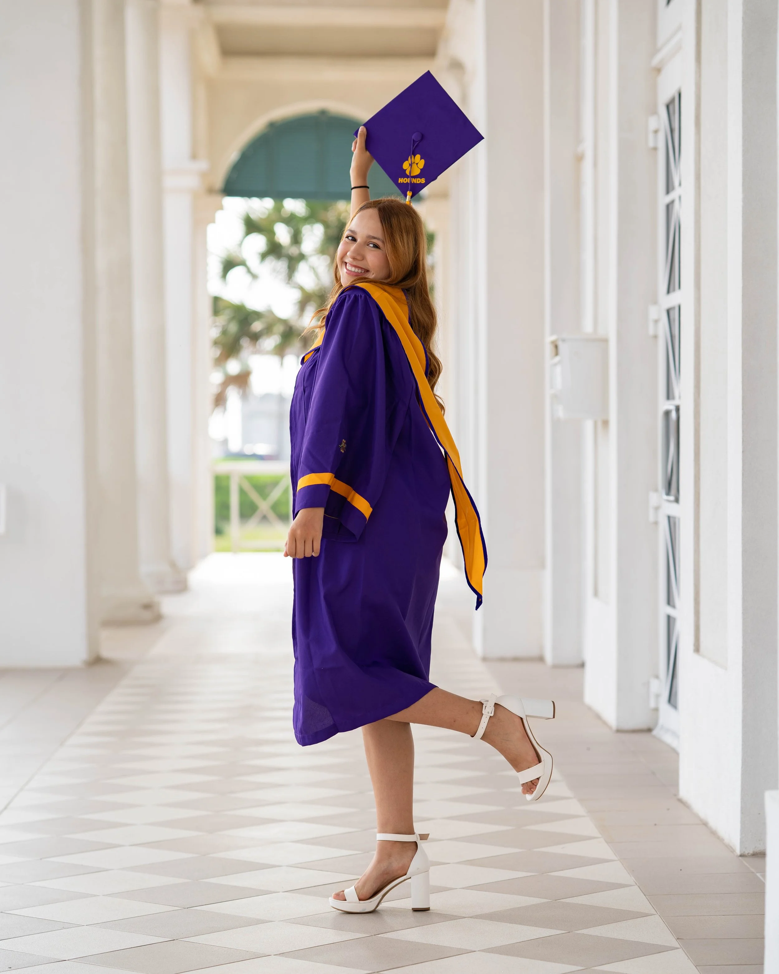 A young woman in a white dress and white heels wearing a purple graduation gown and cap, adjusting her cap, standing in a bright hallway.