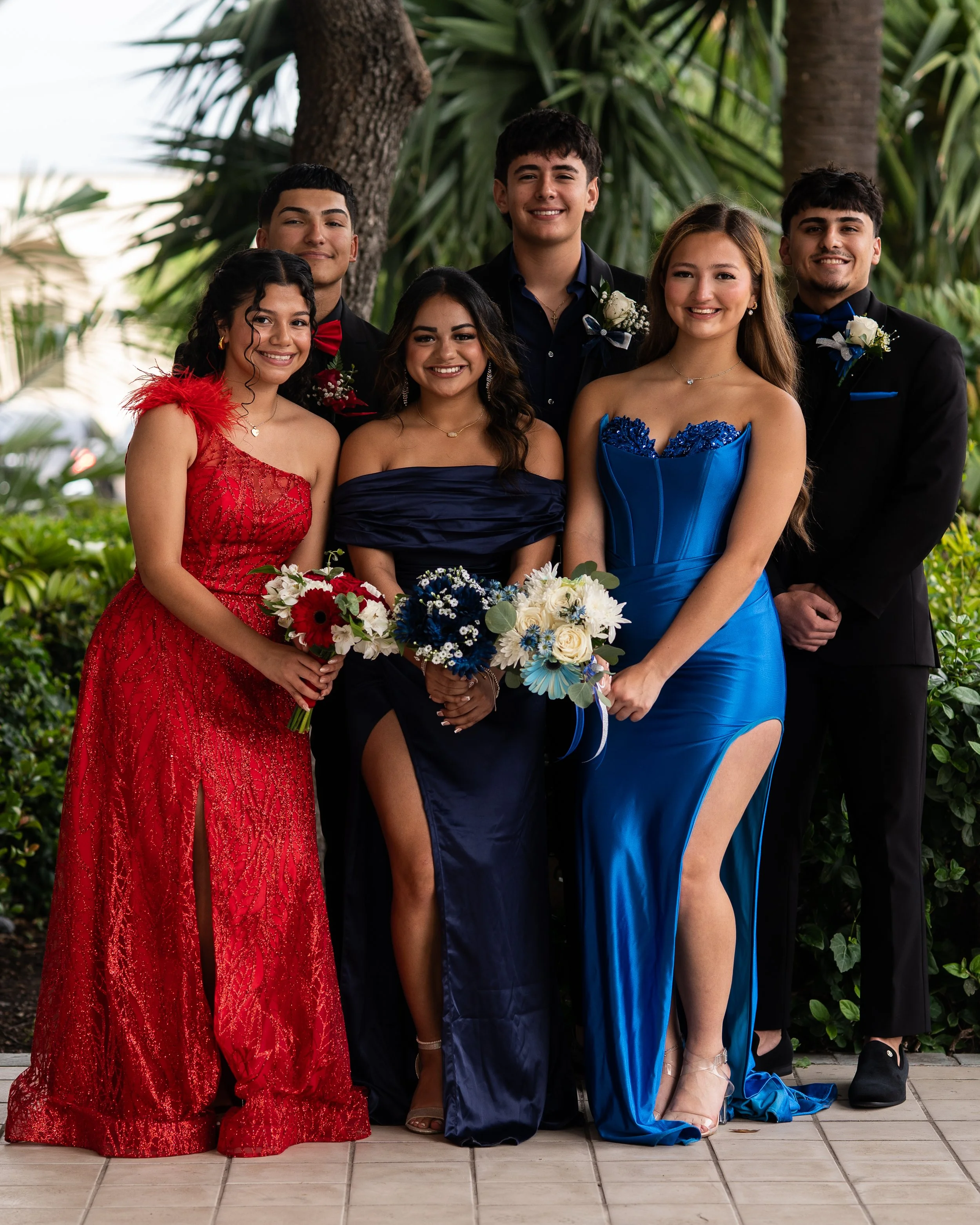Group of six young people dressed in formal attire, standing outdoors near trees and greenery, smiling at the camera.