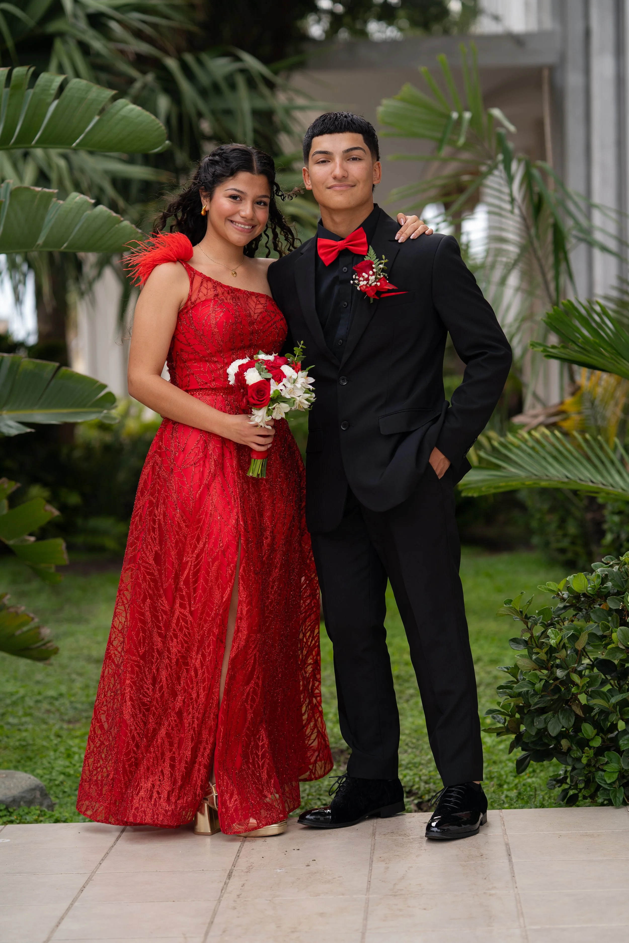 Young couple dressed in formal attire, standing outdoors with greenery, the woman in a red dress holding a bouquet and the man in a black suit with a red bow tie, posing for a photo.